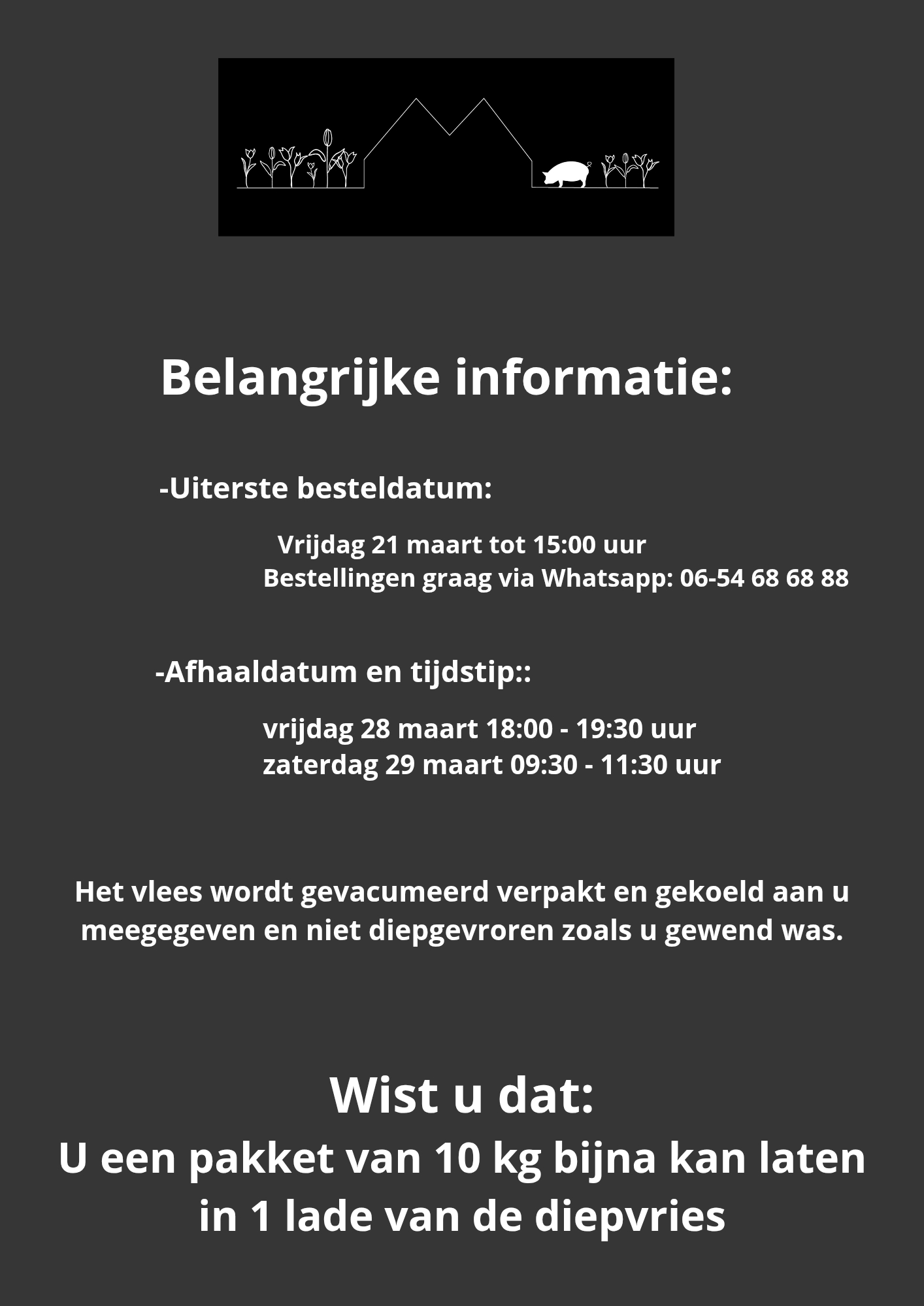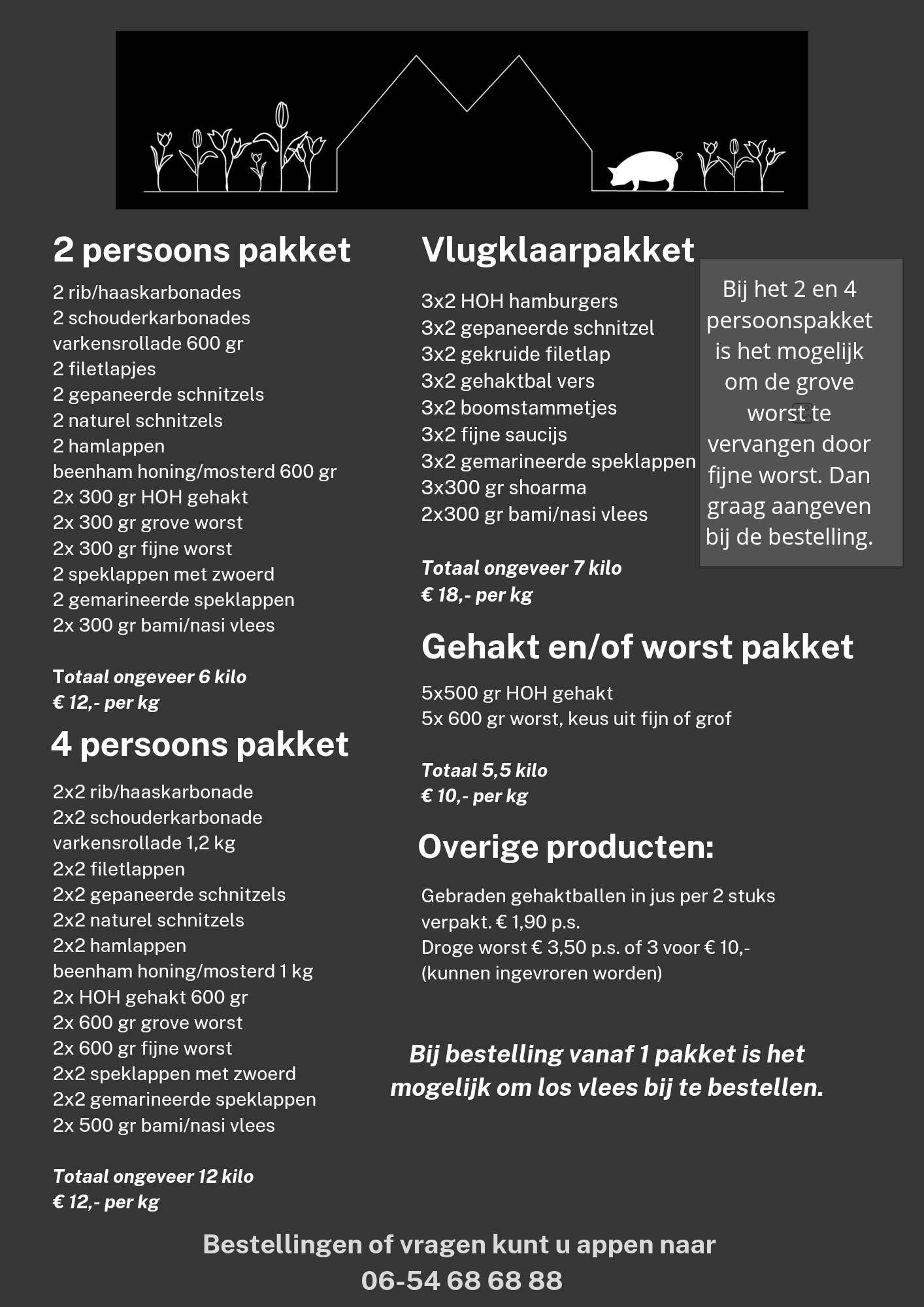 Hieronder vind u onze pakketten. Waarom een pakket en niet alleen los vlees? Dat komt omdat wij het gehele varken moeten verkopen. Wij kunnen niet met restvlees blijven zitten. Wanneer u een pakket besteld is het mogelijk om daarnaast nog los vlees bij te bestellen.